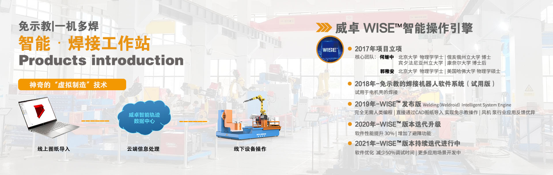 無錫威卓智能機器人有限公司成立于2017年,是無錫市政府引進的科技領軍型高新技術企業(yè),公司研發(fā)團隊80余人,我們堅持自主創(chuàng)新,利用自主開發(fā)的虛擬制造技術對傳統焊接行業(yè)進行升級改造。 公司主推的工業(yè)風機系列-智能焊接工作站產品,具有免示教、實時跟蹤、簡易工裝、傻瓜式操作等優(yōu)點,真正幫助企業(yè)解決了招焊工難,用工成本高,焊接質量不穩(wěn)定等問題。